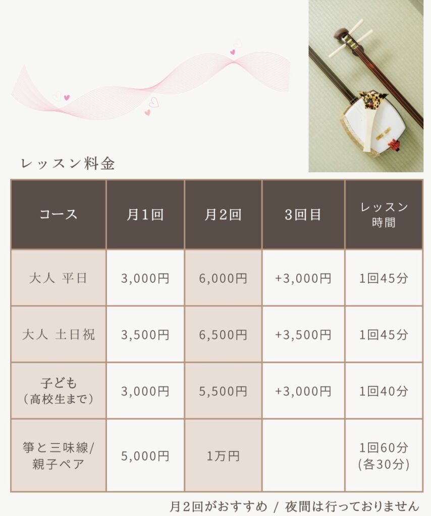個別指導なので、周りを気にせず自分のペースで学べるのも魅力のひとつ。 お稽古を通じて、日常にちょっとした特別な時間を取り入れてみませんか?伝統と新鮮さが交わる世界で、あなたの「音」を紡ぎましょう。