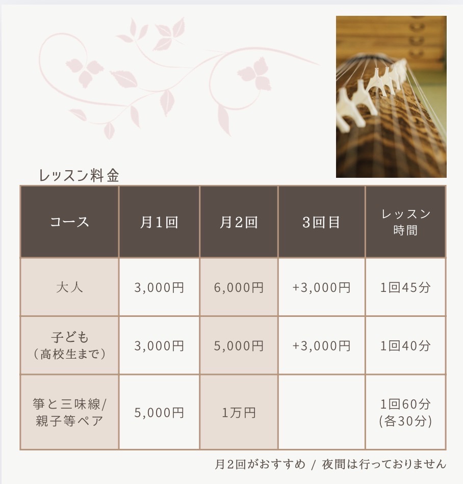 個別指導なので、周りを気にせず自分のペースで学べるのも魅力のひとつ。 お稽古を通じて、日常にちょっとした特別な時間を取り入れてみませんか?伝統と新鮮さが交わる世界で、あなたの「音」を紡ぎましょう。